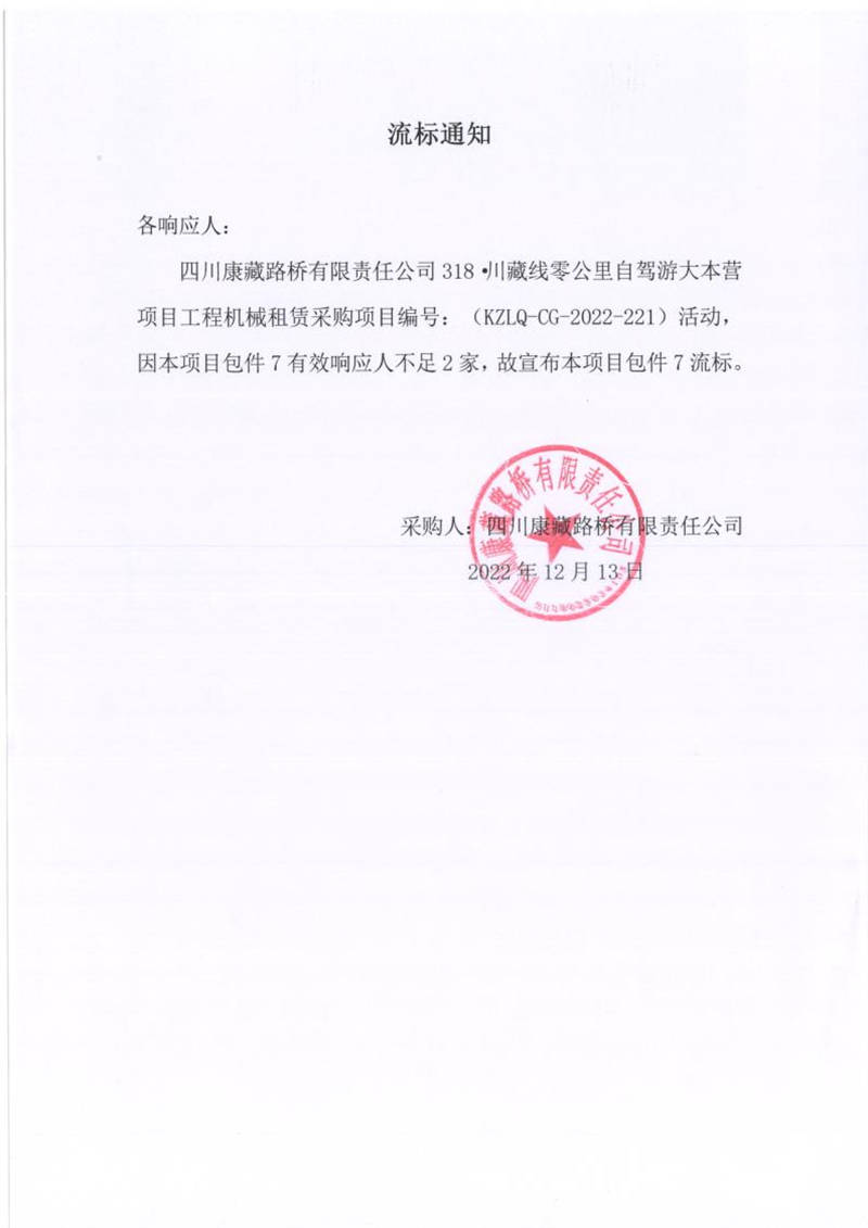 四川康藏路桥有限责任公司318.川藏线零公里自驾游大本营项目工程机械租赁采购(包件7)流标通知