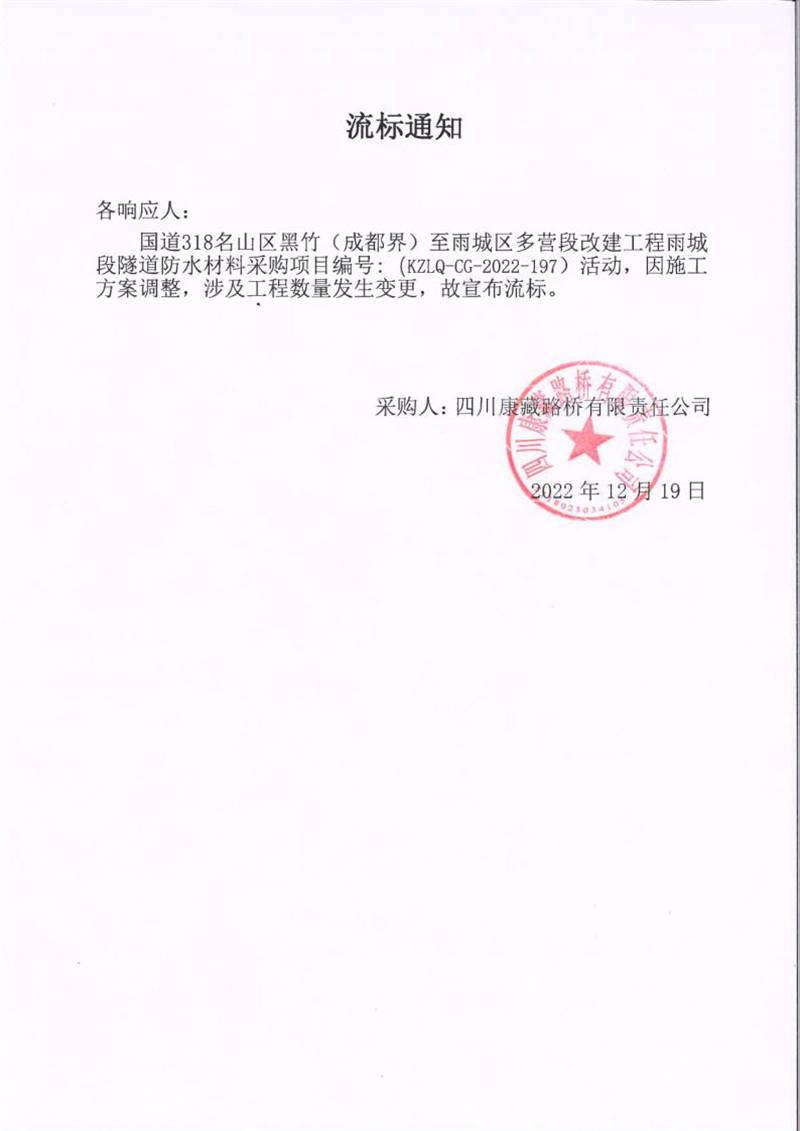 四川康藏路桥有限责任公司国道318名山区黑竹(成都界)至雨城区多营段改建工程雨城段隧道防水材料采购流标通知