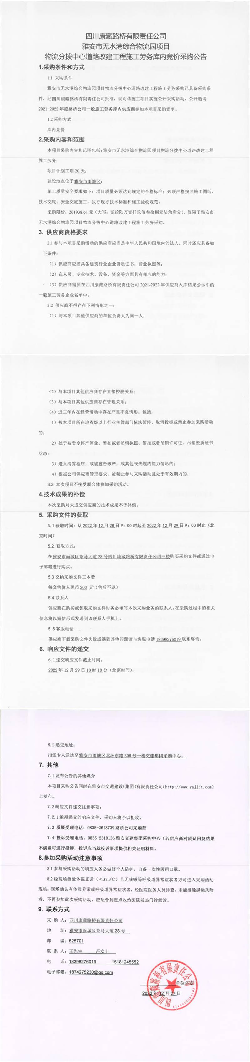 四川康藏路桥有限责任公司雅安市无水港综合物流园项目物流分拨中心道路改建工程施工劳务库内竞价采购公告