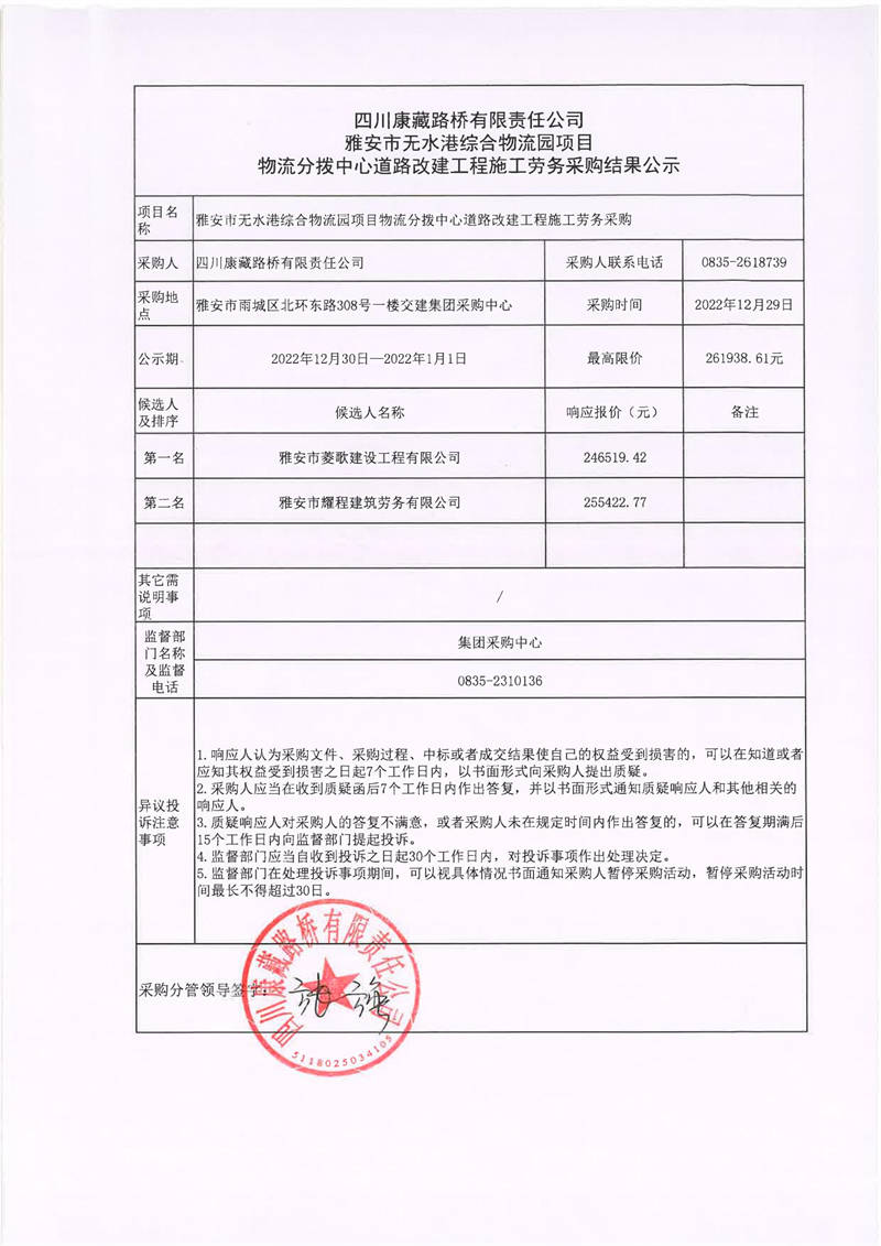 四川康藏路桥有限责任公司雅安市无水港综合物流园项目物流分拨中心道路改建工程施工劳务采购结果公示