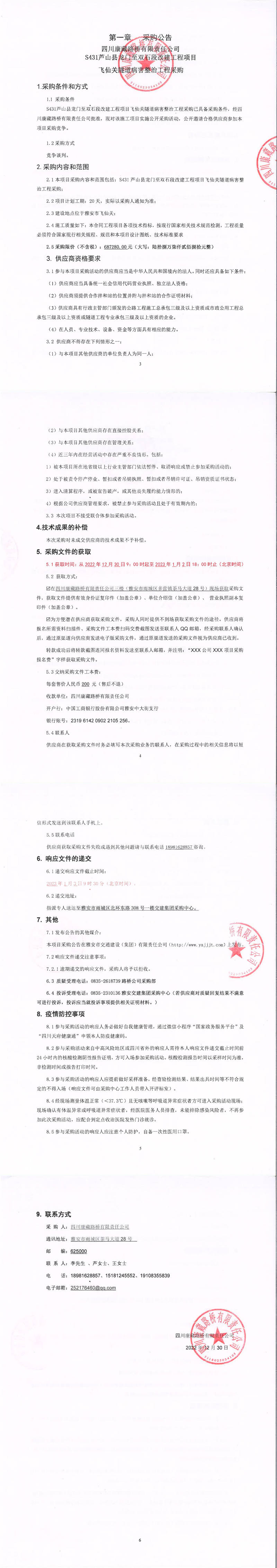 四川康藏路桥有限责任公司S431芦山县龙门至双石段改建工程项目飞仙关隧道病害整治工程采购采购公告