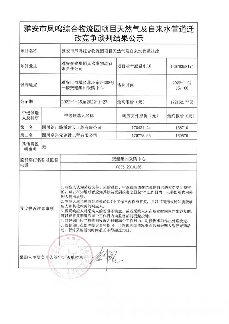米兰体育-米兰(中国)官网 无水港物流有限责任公司雅发市凤鸣综合物流园项目天然气及自来水管道迁改竞争谈判结果公示
