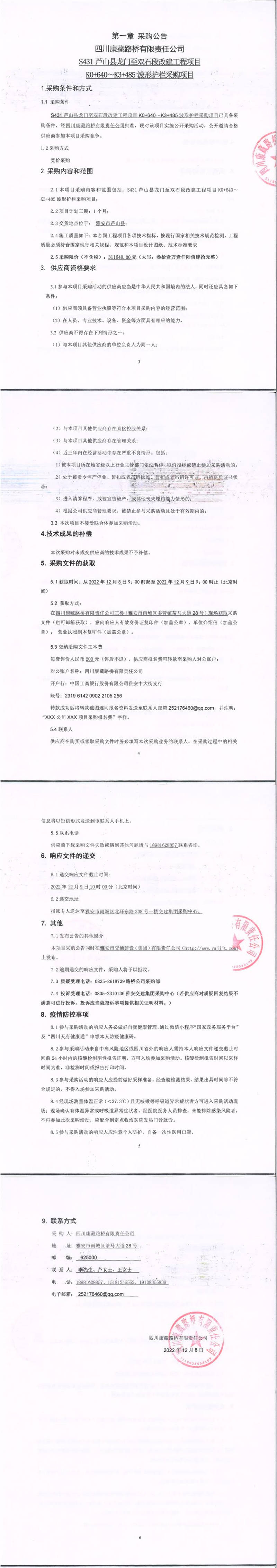四川康藏路桥有限责任公司S431芦山县龙门镇至双石段改建工程项目K0+640-K3+485波形护栏采购项目采购公告
