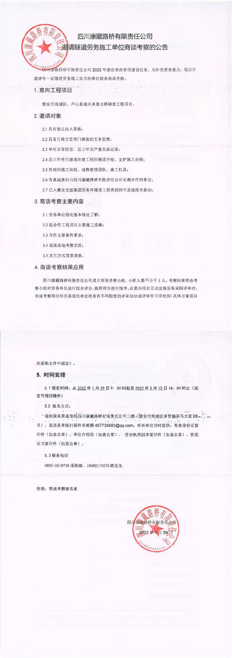 四川康藏路桥有限责任公司邀请隧道劳务施工单位商谈考察的公告