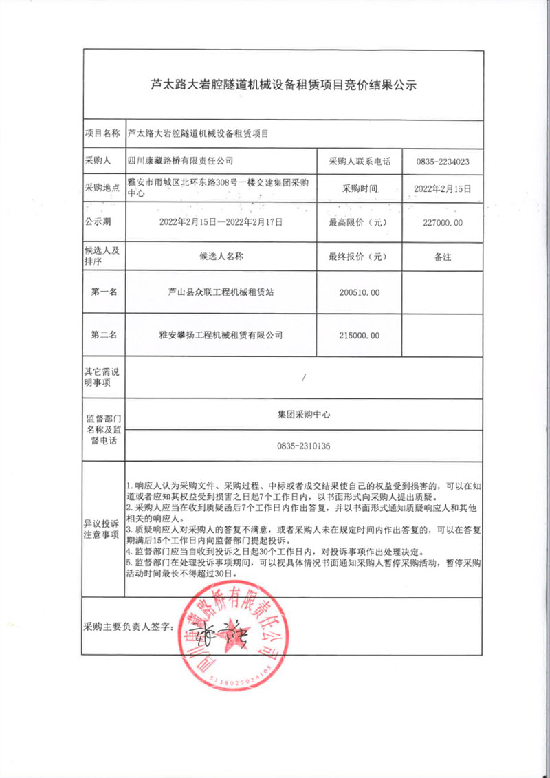 四川康藏路桥有限责任公司芦太路大岩腔隧道机械设备租赁项目竞价结果公示