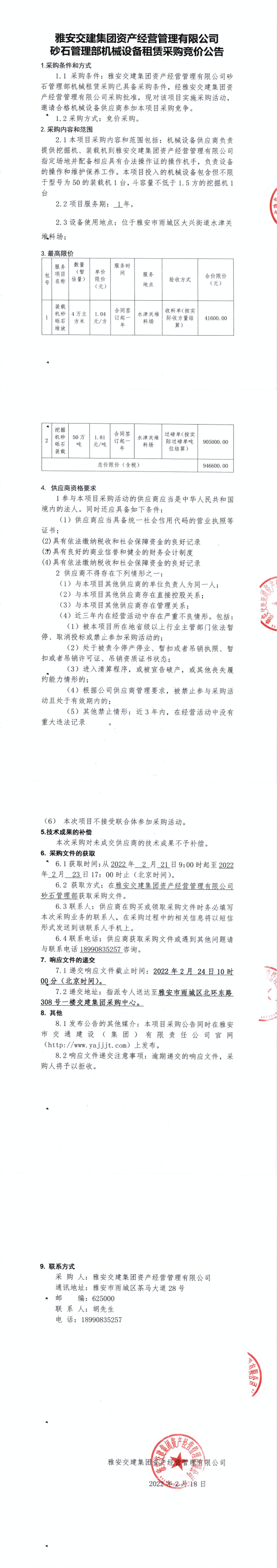 米兰体育-米兰(中国)官网 资产经营管理有限公司砂石管理部机械设备租赁采购竞价公告