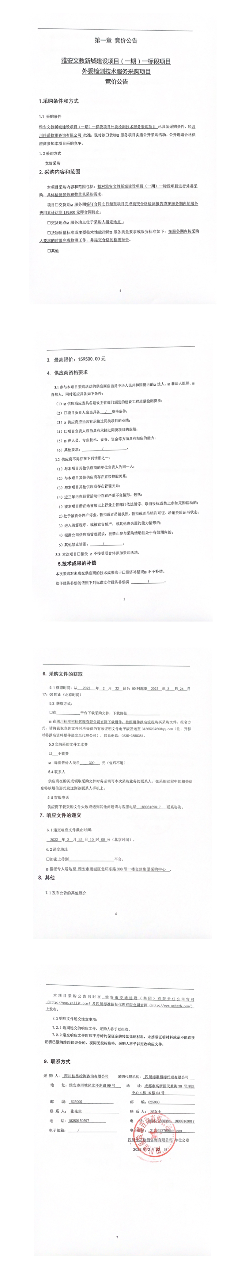 四川佳岳检测咨询有限公司雅安文教新城建设项目(一期)一标段项目外委检测技术服务采购项目竞价公告