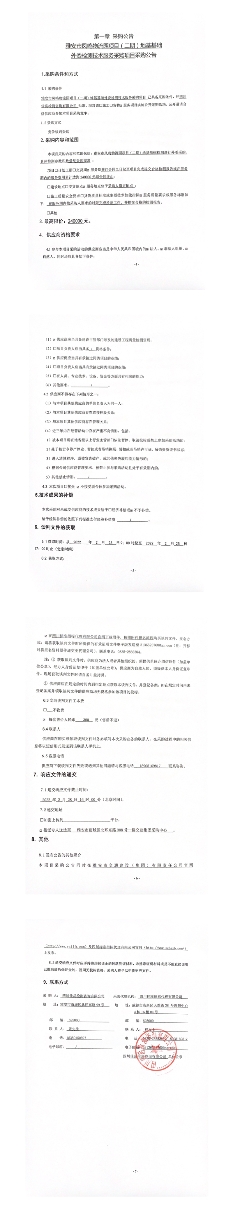 四川佳岳检测咨询有限公司雅安市凤鸣物流园项目(二期)地基基础外委检测技术服务采购项目采购公告
