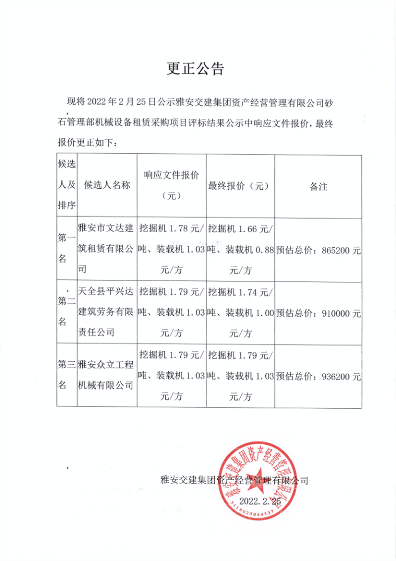 米兰体育-米兰(中国)官网 资产经营管理有限公司砂石管理部机械设备租赁采购项目评标结果公示更正公告