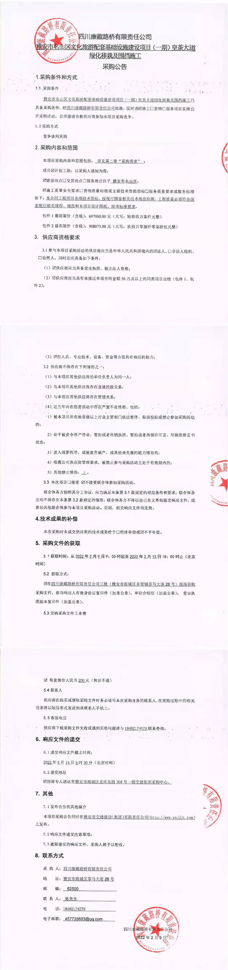 四川康藏路桥有限责任公司雅安市名山区文化旅游配套基础设施建设项目(一期)皇茶大道绿化移栽及围挡施工采购公告