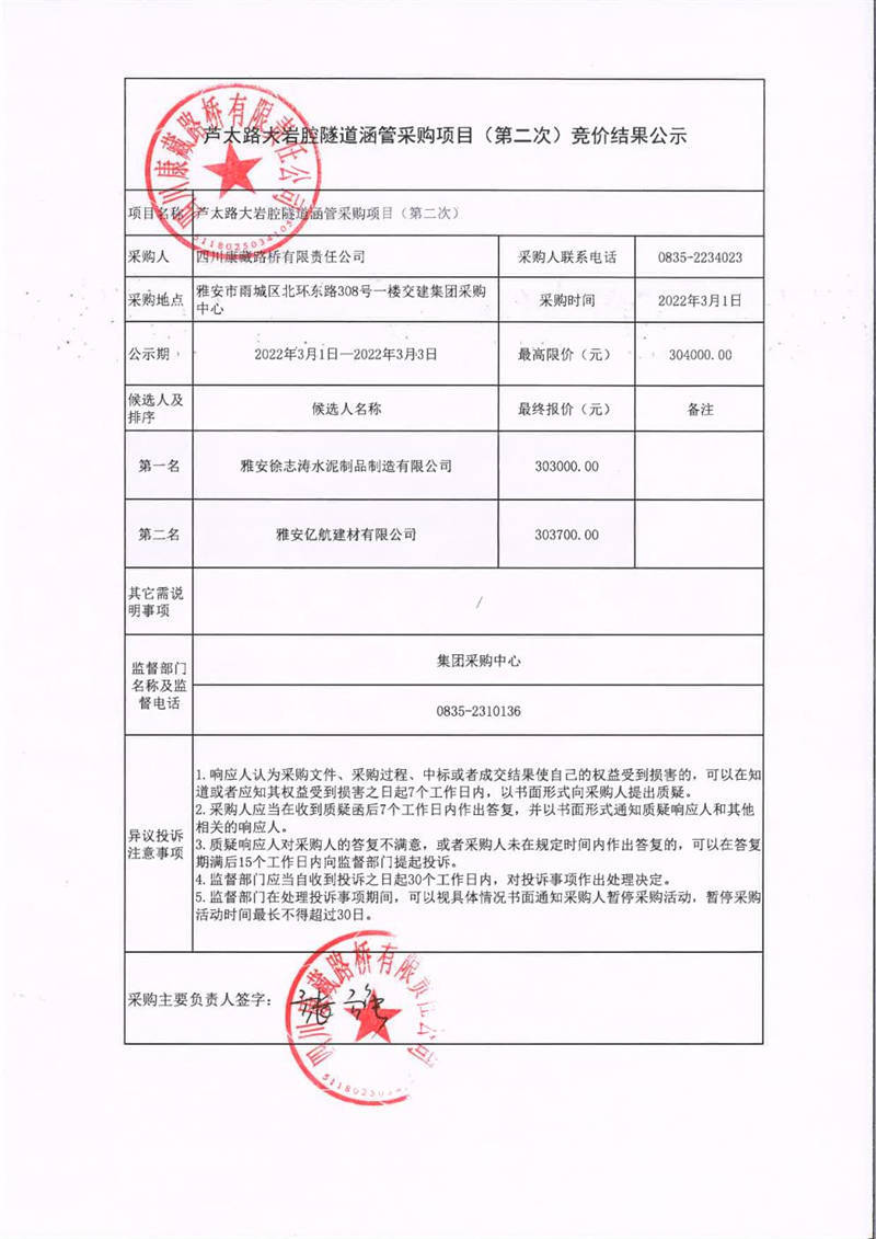 四川康藏路桥有限责任公司芦太路大岩腔隧道涵管采购项目(第二次)竞价结果公示