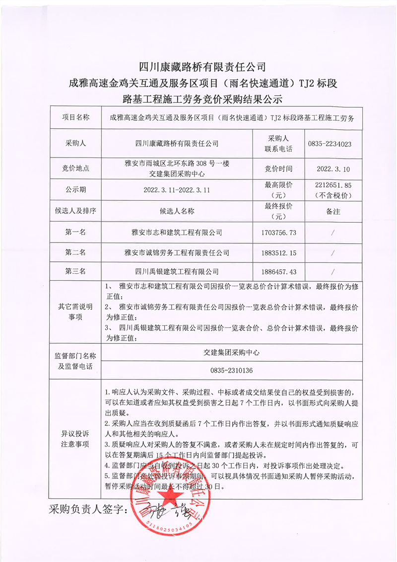 四川康藏路桥有限责任公司成雅高速金鸡关互通及服务区项目(雨名快速通道)TJ2标段路基工程施工劳务竞价采购结果公示