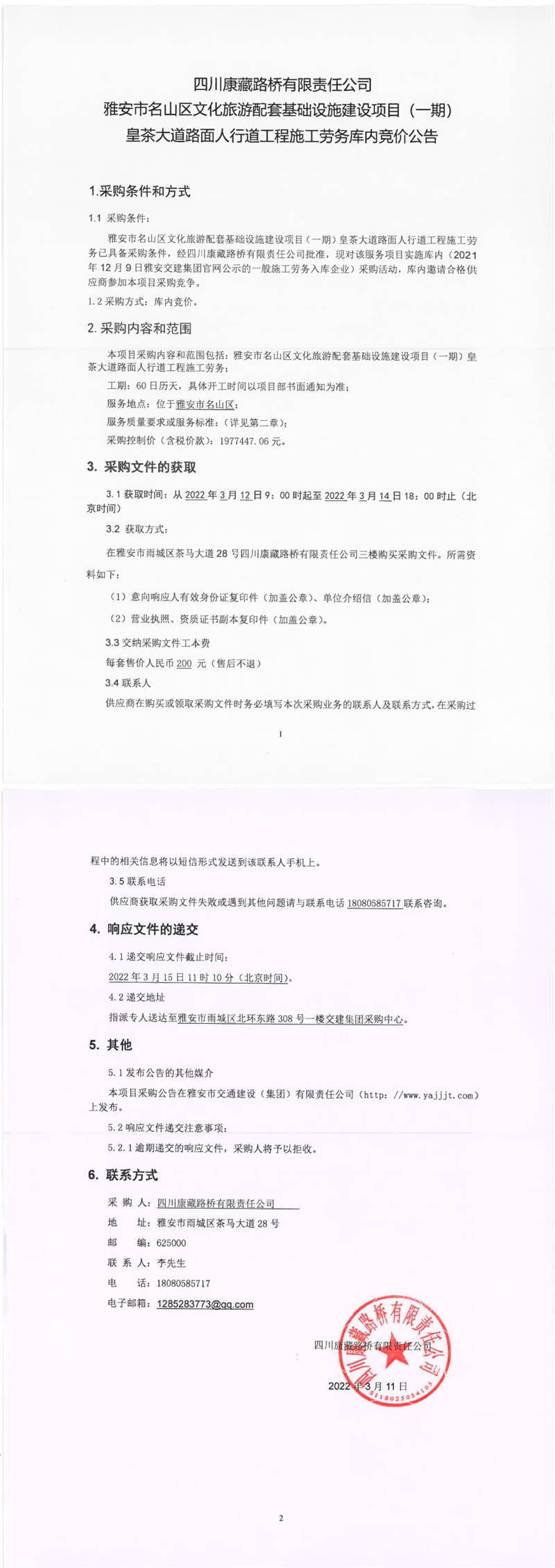 四川康藏路桥有限责任公司雅安市名山区文化旅游配套基础设施建设项目(一期)皇茶大道路面人行道工程施工劳务库内竞价公告