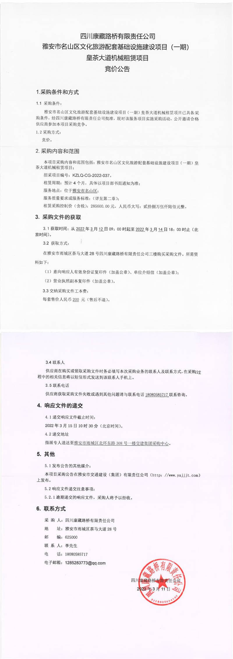 四川康藏路桥有限责任公司雅安市名山区文化旅游配套基础设施建设项目(一期)皇茶大道机械租赁项目竞价公告