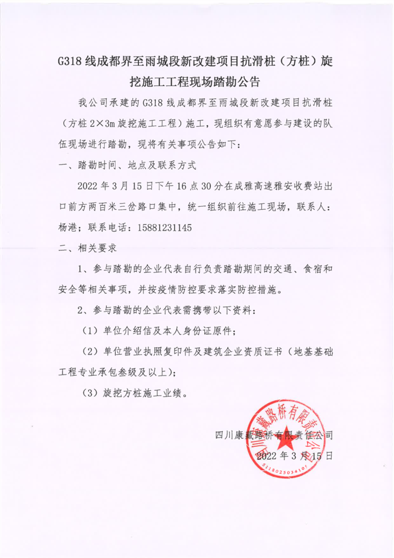 四川康藏路桥有限责任公司G318线成都界至雨城段新改建项目抗滑桩(方桩)旋挖施工工程现场踏勘公告