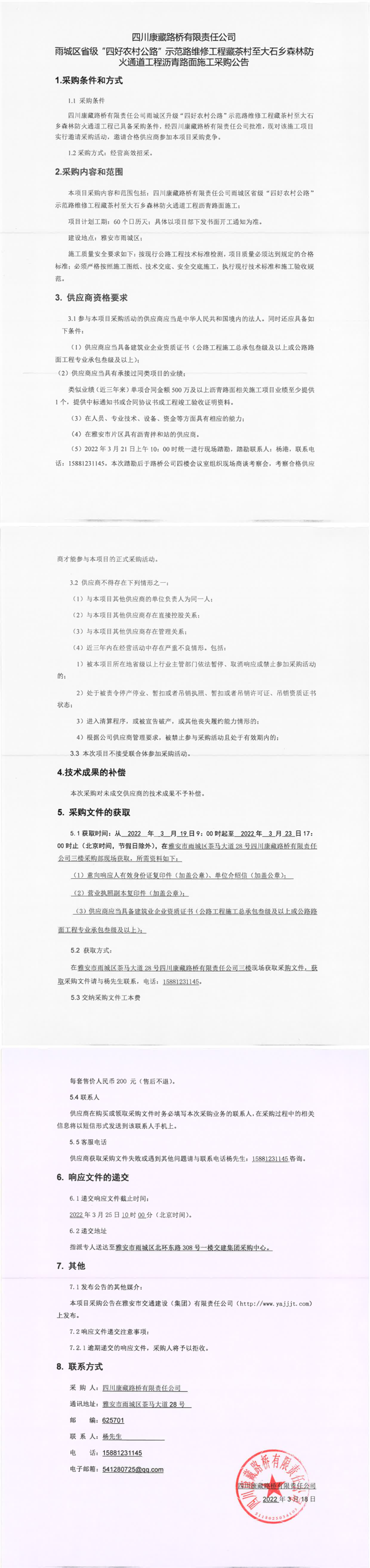 四川康藏路桥有限责任公司雨城区省级“四好农村公路”示范路维修工程藏茶村至大石乡森林防火通道工程沥青路面施工采购公告