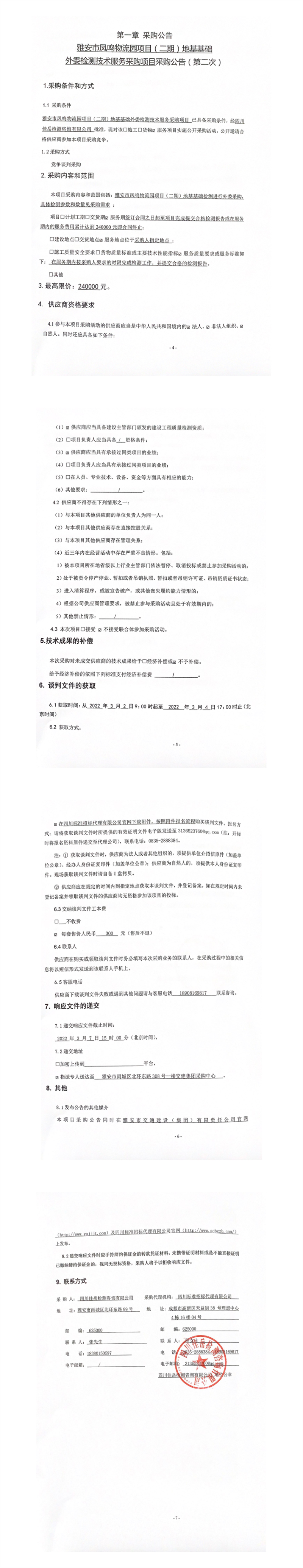 四川佳岳检测咨询有限公司雅安市凤鸣物流园项目(二期)地基基础外委检测技术服务采购项目采购公告(第二次)