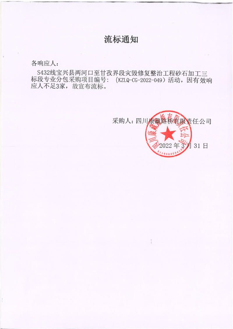 四川康藏路桥有限责任公司S432线宝兴县两河口至甘孜界段灾毁修复整治工程砂石加工三标段专业分包采购项目流标通知