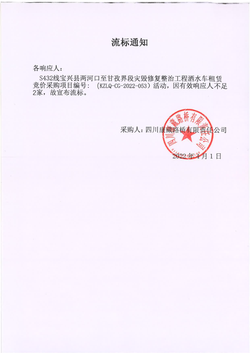 四川康藏路桥有限责任公司S432线宝兴县两河口至甘孜界段灾毁修复整治工程洒水车租赁竞价采购项目流标通知
