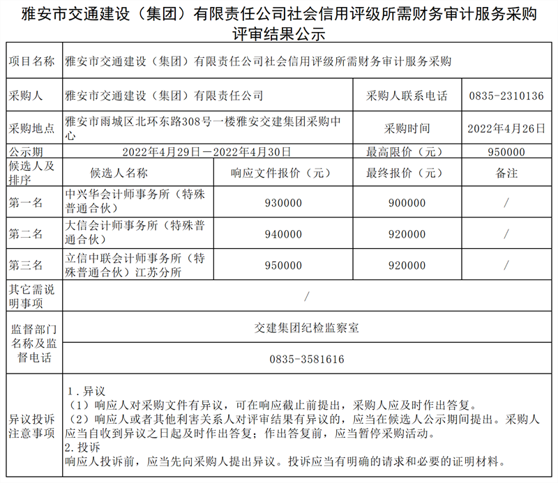 米兰体育-米兰(中国)官网 社会信用评级所需财务审计服务采购评审结果公示
