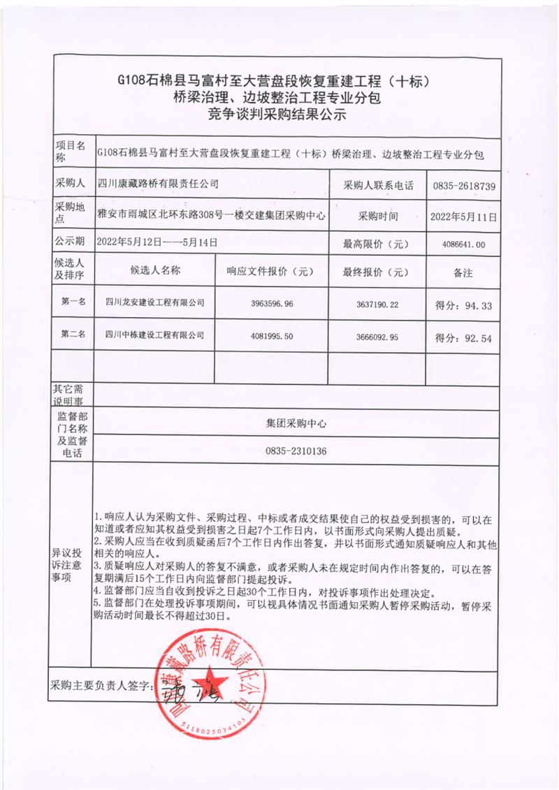 四川康藏路桥有限责任公司G108线石棉县马富村至大营盘段恢复重建工程(十标)桥梁治理、边坡整治工程专业分包竞争谈判采购结果公示