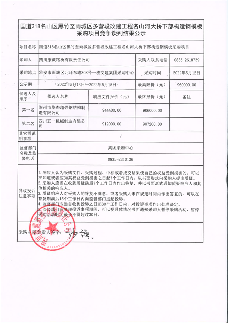 四川康藏路桥有限责任公司国道318名山区黑竹至雨城区多营段改建工程名山河大桥下部构造钢模板采购项目竞争谈判结果公示
