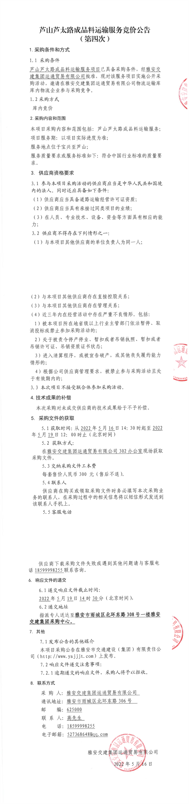米兰体育-米兰(中国)官网 运通贸易有限公司芦山芦太路成品料运输服务竞价采购活动第三次流标通知