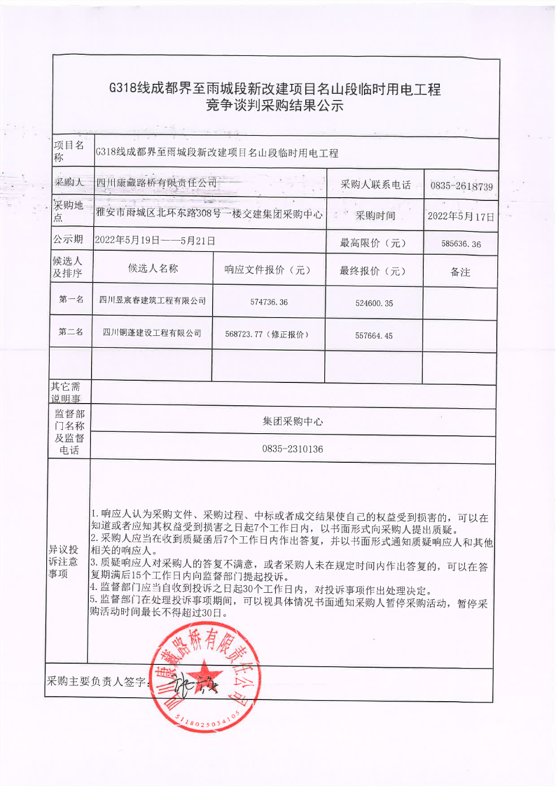 四川康藏路桥有限责任公司G318线成都界至雨城段新改建项目名山段临时用电工程竞争谈判采购结果公示