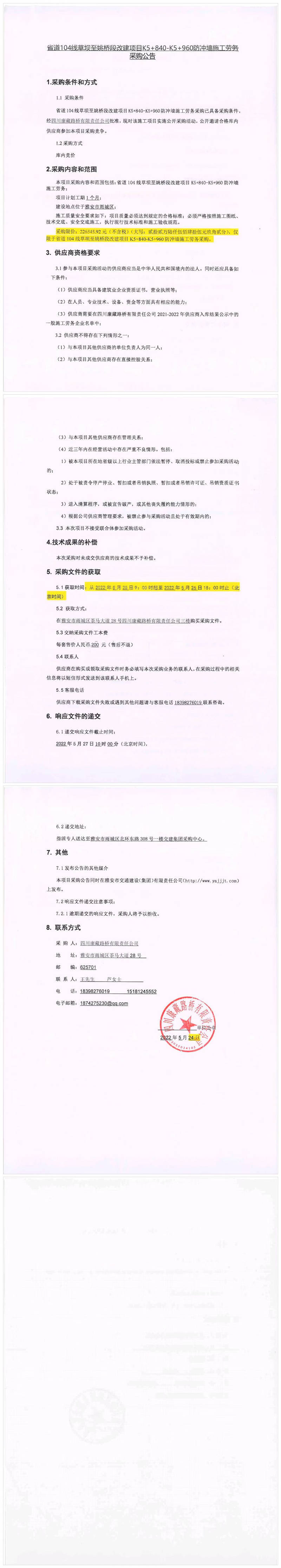 四川康藏路桥有限责任公司省道104线草坝至姚桥段改建项目K5+840-K5+960防冲墙施工劳务采购公告
