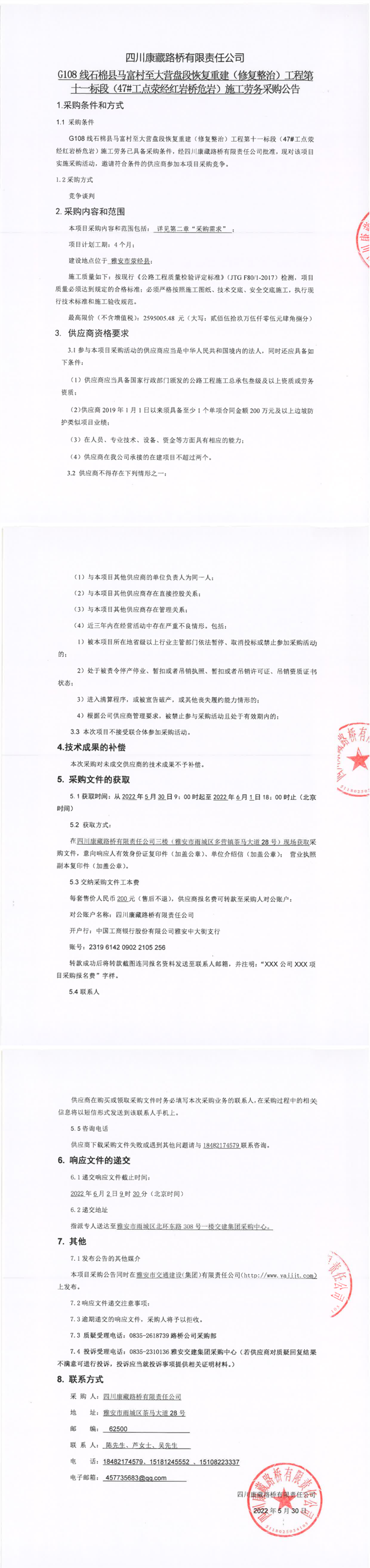 四川康藏路桥有限责任公司G108线石棉县马富村至大营盘段恢复重建(修复整治)工程第十一标段(47#工点荥经红岩桥危岩)施工劳务采购公告