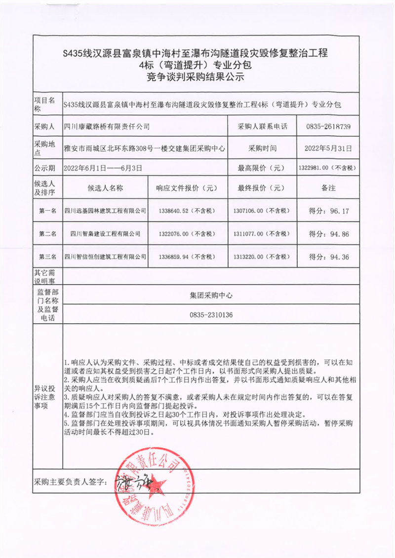 四川康藏路桥有限责任公司S435线汉源县富泉镇中海村至瀑布沟隧道段灾毁修复整治工程4标(弯道提升)专业分包竞争谈判采购结果公示