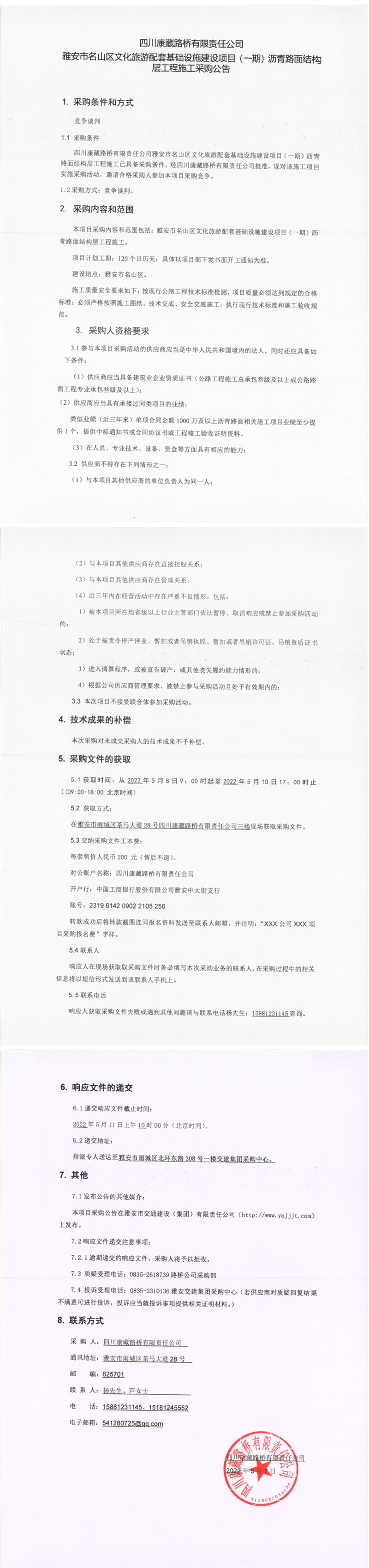 四川康藏路桥有限责任公司雅安市名山区文化旅游配套基础设施建设项目(一期)沥青路面结构层工程施工采购公告