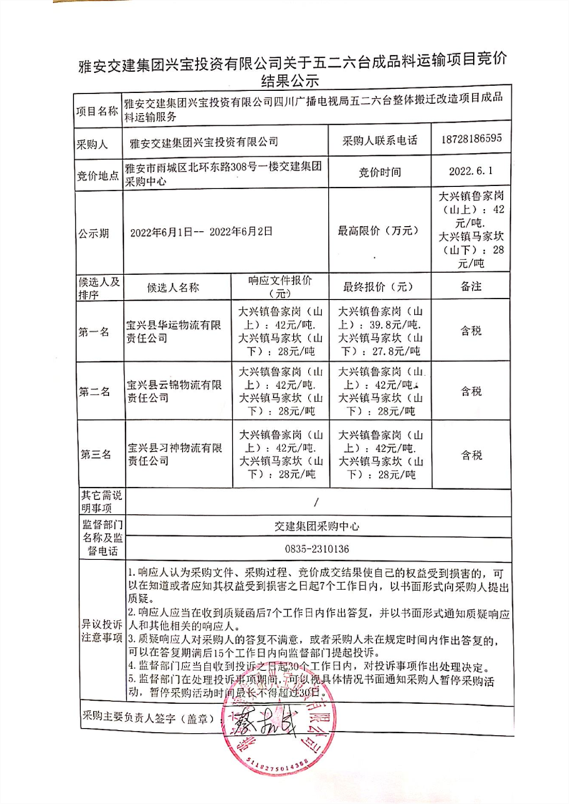 米兰体育-米兰(中国)官网 兴宝投资有限公司关于五二六台成品料运输项目竞价结果公示