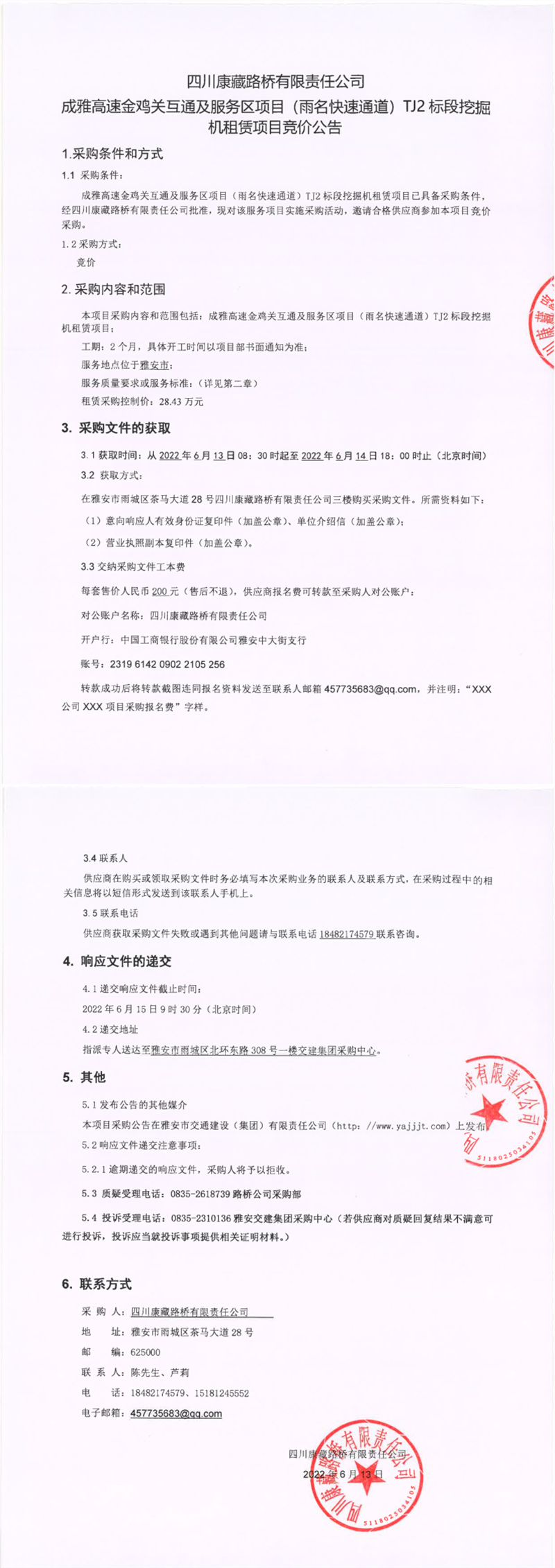 四川康藏路桥有限责任公司成雅高速金鸡关互通及服务区项目(雨名快速通道)TJ2标段挖掘机租赁项目竞价公告