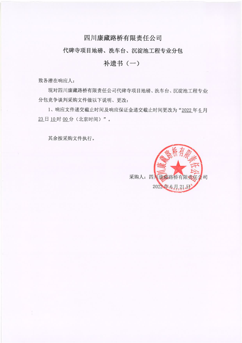 四川康藏路桥有限责任公司代碑寺项目地磅、洗车台、沉淀池工程专业分包补遗书(一)