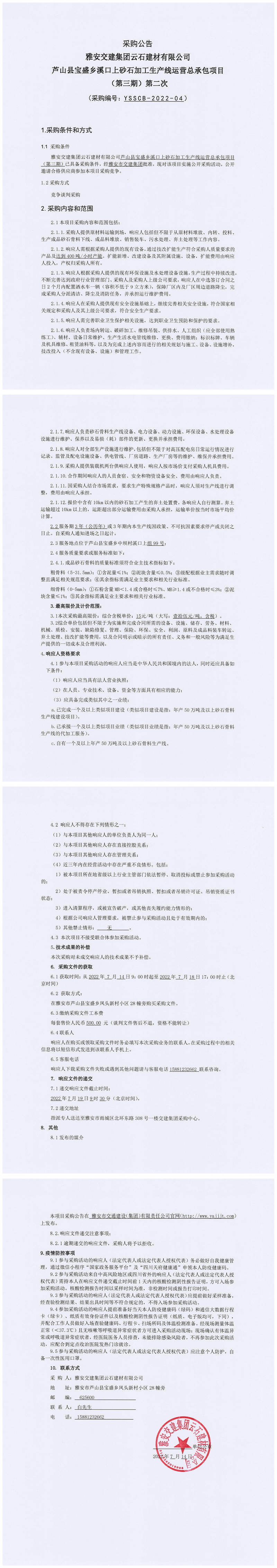 米兰体育-米兰(中国)官网 云石建材有限公司芦山县宝盛乡溪口上砂石加工生产线运营总承包项目(第三期)第二次采购公告