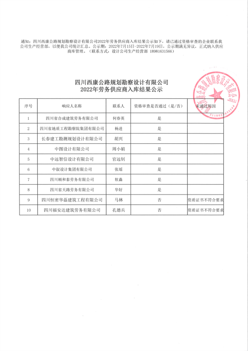 四川西康公路规划勘察设计有限公司2022年劳务供应商入库结果公示