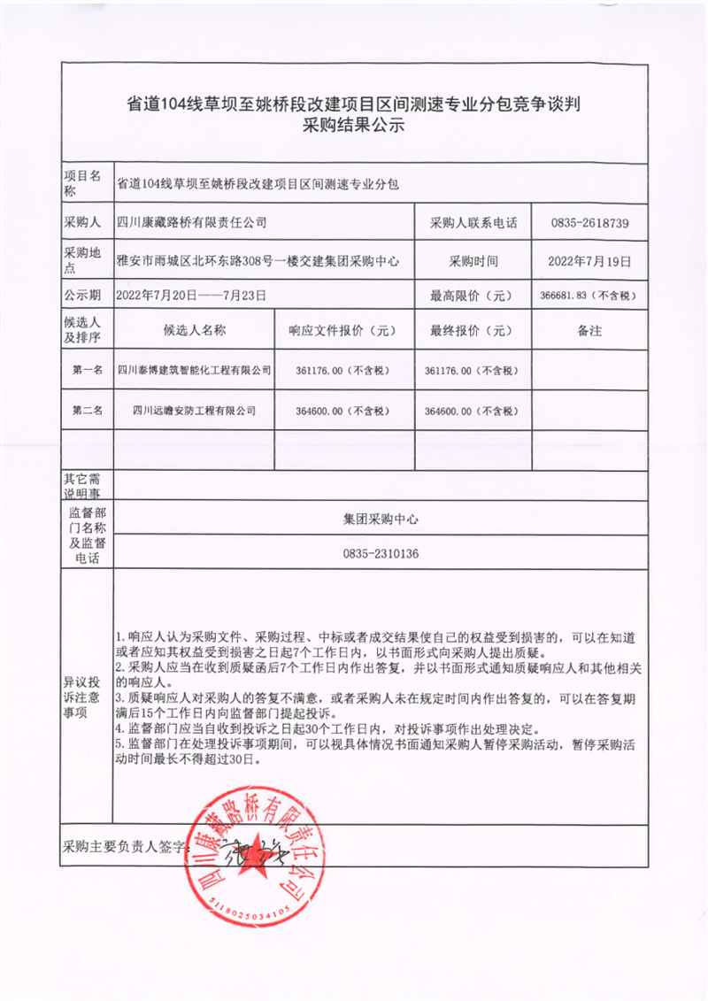 四川康藏路桥有限责任公司省道104线草坝至姚桥段改建项目区间测速专业分包竞争谈判采购结果公示