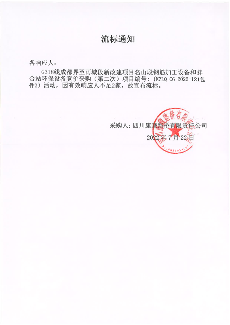 四川康藏路桥有限责任公司G318线成都界至雨城段新改建项目名山段钢筋加工设备和拌合站环保设备竞价采购(第二次)包件2流标通知