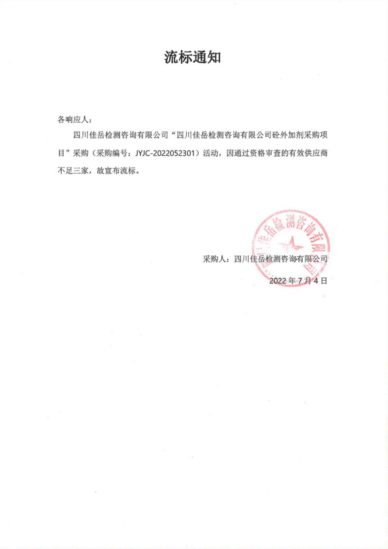 四川佳岳检测咨询有限公司砼外加剂采购项目流标通知