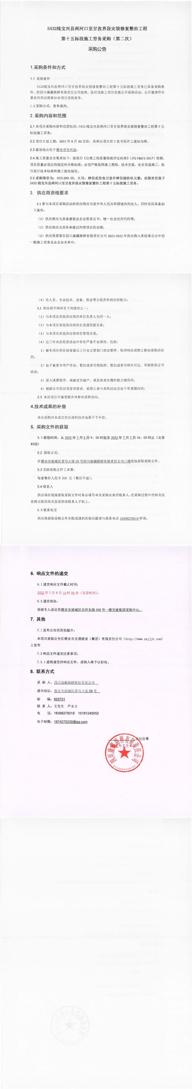 四川康藏路桥有限责任公司S432线宝兴县两河口至甘孜界段灾毁修复整治工程第十五标段施工劳务采购(第二次)采购公告