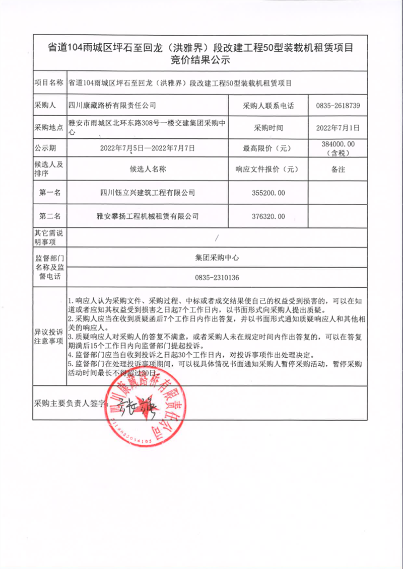 四川康藏路桥有限责任公司省道104雨城区坪石至回龙(洪雅界)段改建工程50型装载机租赁项目竞价结果公示