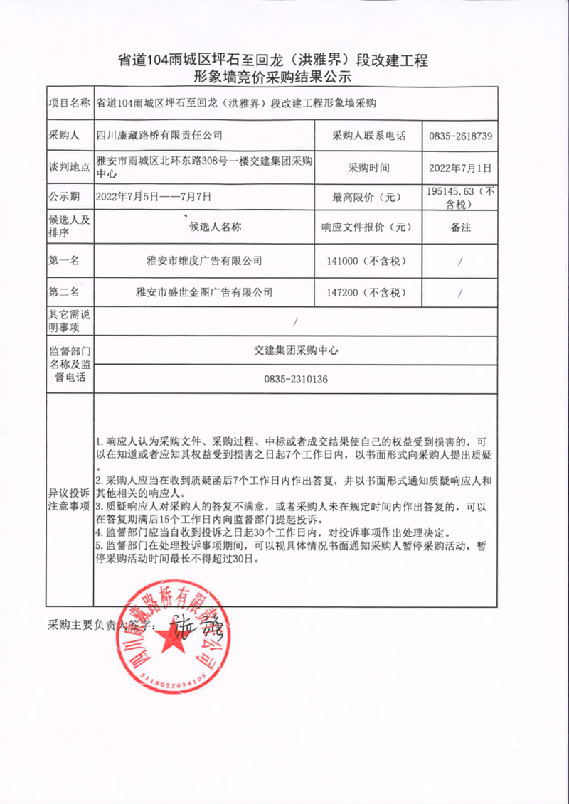 四川康藏路桥有限责任公司省道104雨城区坪石至回龙(洪雅界)段改建工程形象墙竞价采购结果公示