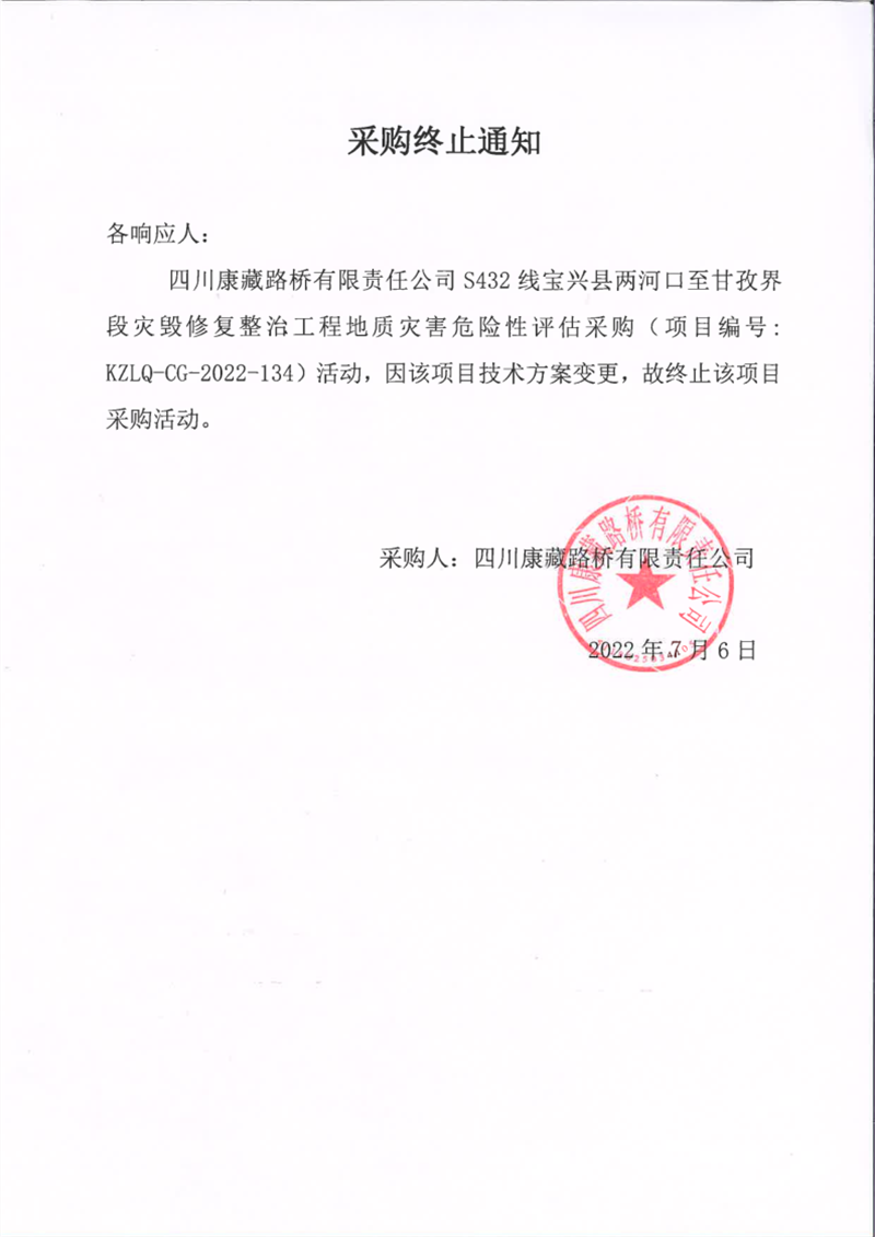 四川康藏路桥有限责任公司S432线宝兴县两河口至甘孜界段灾毁修复整治工程地质灾害危险性评估采购终止通知