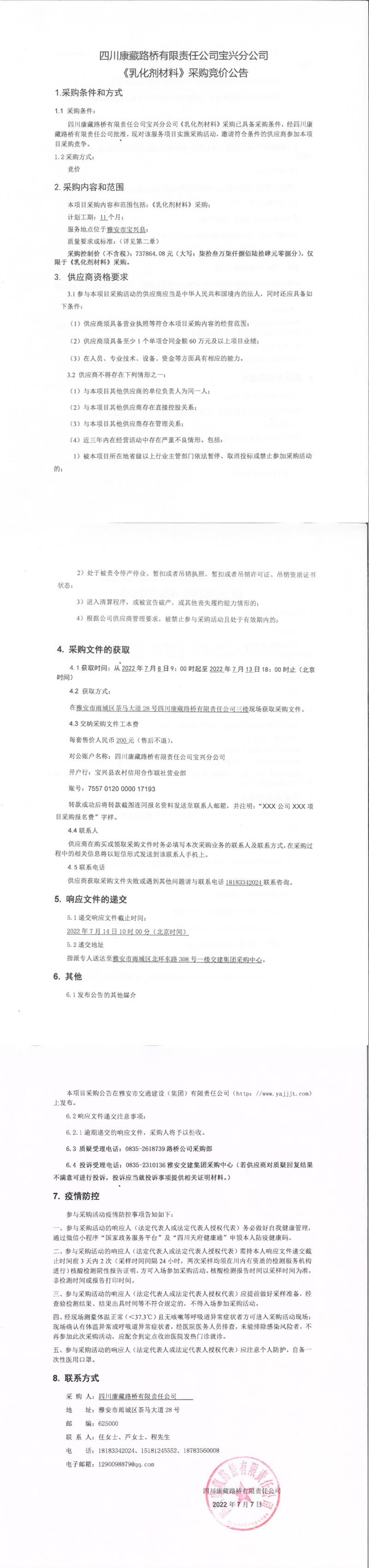 四川康藏路桥有限责任公司宝兴分公司乳化剂材料采购竞价公告
