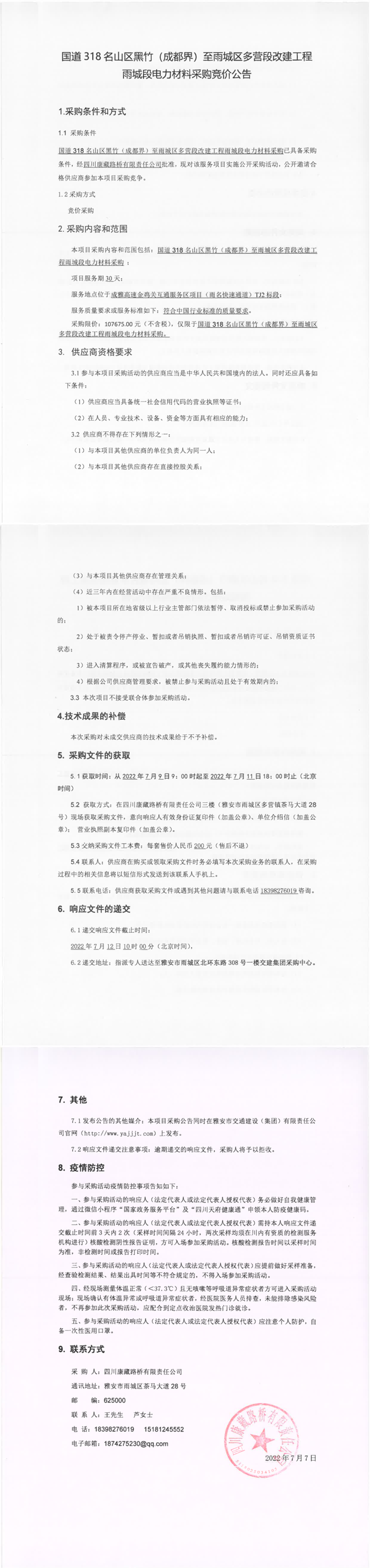 四川康藏路桥有限责任公司国道318名山区黑竹(成都界)至雨城区多营段改建工程雨城段电力材料采购竞价公告