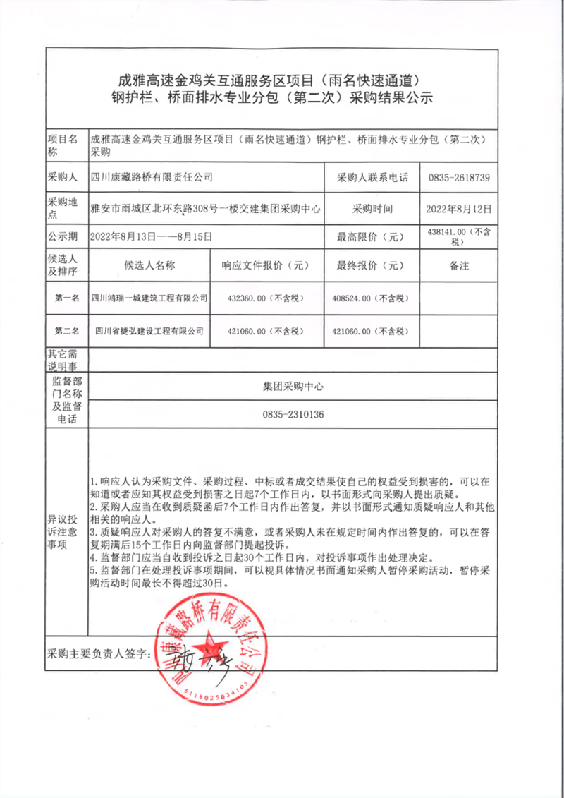 四川康藏路桥有限责任公司成雅高速金鸡关互通服务区项目(雨名快速通道)钢护栏、桥面排水专业分包(第二次)采购结果公示