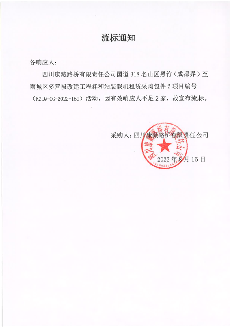 四川康藏路桥有限责任公司国道318名山区黑竹(成都界)至雨城区多营段改建工程拌和站装载机租赁采购包件2项目流标通知
