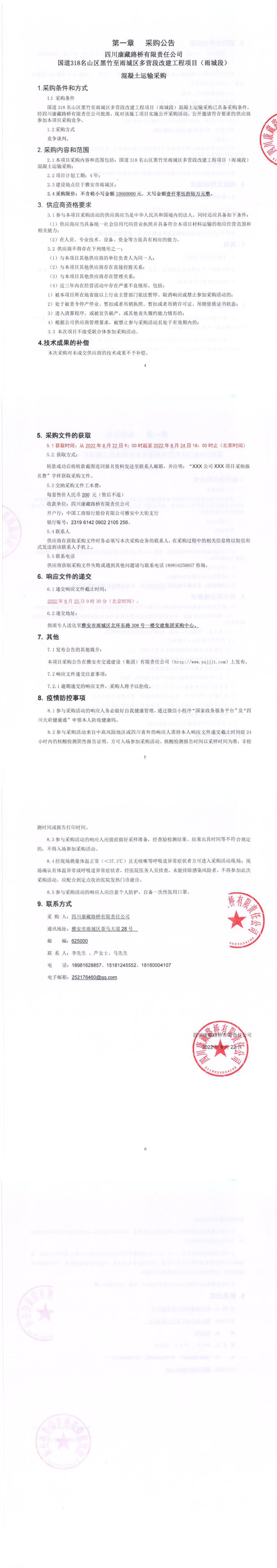 四川康藏路桥有限责任公司国道318名山区黑竹至雨城区多营段改建工程项目(雨城段)混凝土运输采购公告