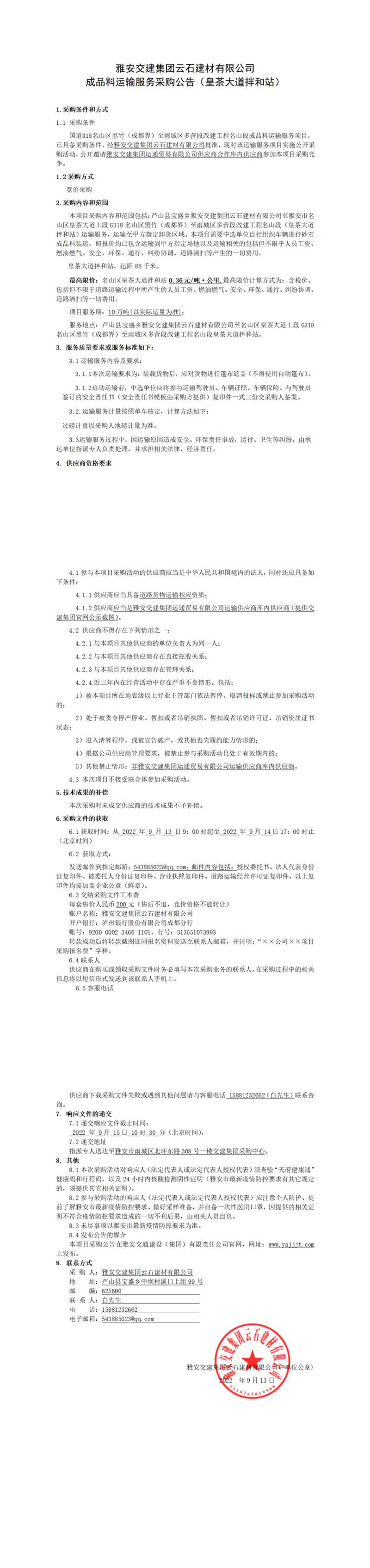 米兰体育-米兰(中国)官网 云石建材有限公司成品料运输服务采购公告(陇西河拌和站)